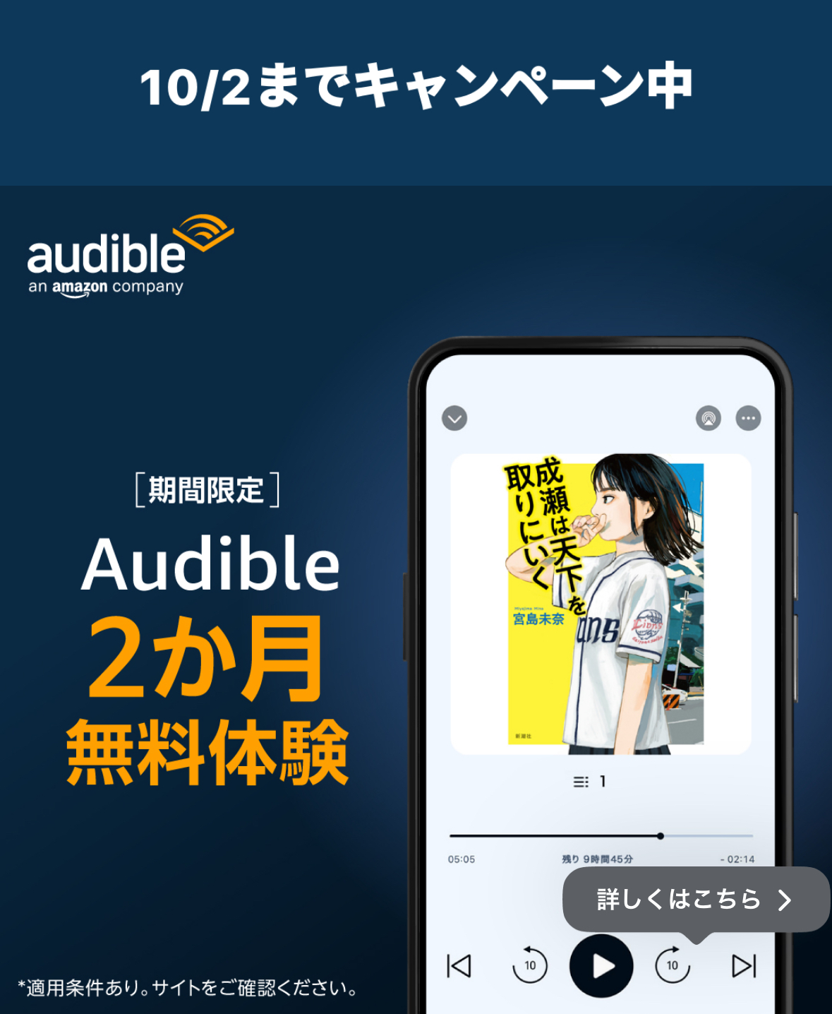 なんと、2024年10月2日まで、Audibleが2ヶ月間無料で