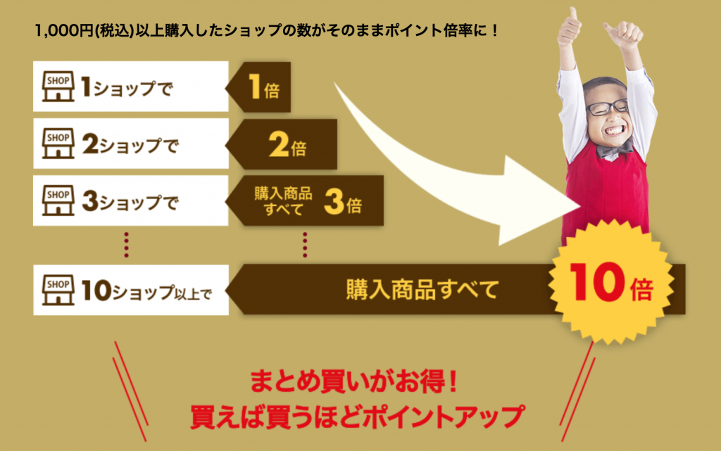 買ったショップ数に応じてポイントが倍々ゲームとなります。