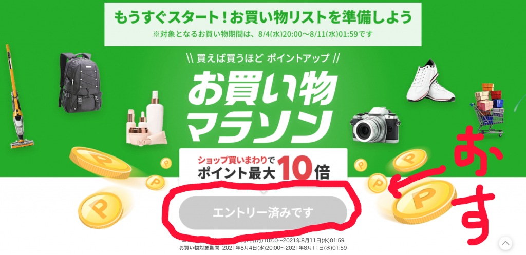 お買い物マラソンでポイント還元を受けるためにはエントリーが必要です。